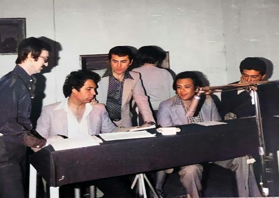 از سمت راست :استاد منوچهر اسماعیلی، زنده یاد مظفر شمس کاظمی، عباس نباتی و زنده یاد حسین عرفانی و نفر ایستاده آقای علی همت مومیوند
